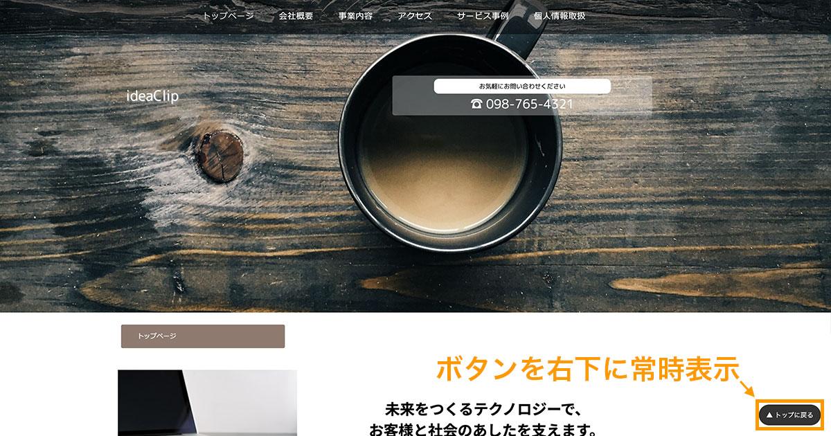 右下に「▲ トップに戻る」というボタンが固定表示され、クリックするとページの一番上に戻る仕組みになります。